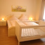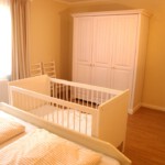 - Ein Schlafzimmer mit Doppelbett, einem Gitterkinderbett und Kleiderschrank.