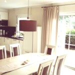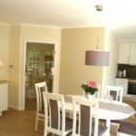- Komplett eingerichtete Küche mit Esstisch für acht Personen.