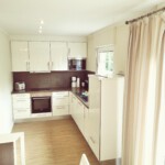 Die komplett eingerichtete Küche ist ausgestattet mit einer Geschirrspülmaschine, Mikrowelle, Kaffeemaschine, einem Backofen, Koch-Ceranfeld, Kühlschrank mit Gefrierfach, und Wasserkocher.